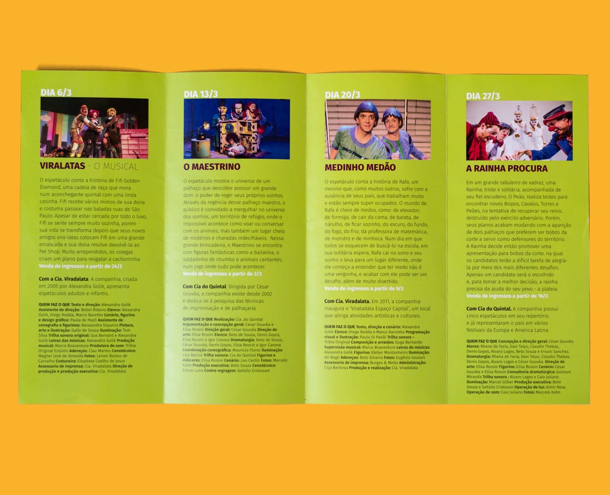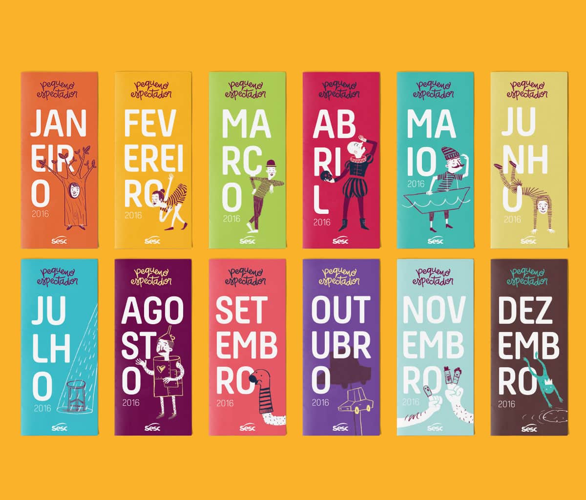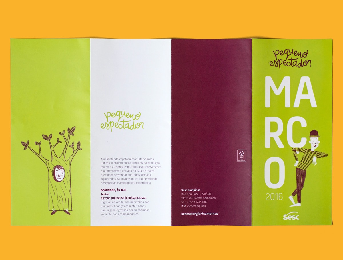 No projeto infantil “Pequeno Espectador”, uma programação mensal de teatro no Sesc Campinas, o desafio foi criar uma identidade visual que dialogasse com as diversas linguagens cênicas, evitando que o material de divulgação favorecesse uma ou outra peça de teatro.